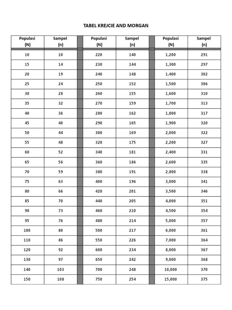 Sampel krejcie dan morgan yang telah menyenaraikan saiz sampel yang berpadanan dengan saiz populasi kajian seperti jadual 3.1. Jadual krejcie dan morgan 1970 pdf. Walau bagaimanapun, bagi memudahkan pengiraan, krejcie dan morgan (1970) telah menyediakan jadual penentuan saiz sampel seperti dalam jadual 3.3.2.1. Jadual 31 jadual penentuan saiz sampel krejcie dan morgan 1970 47. Article information, pdf download for determining sample size for research activities, open epub for .